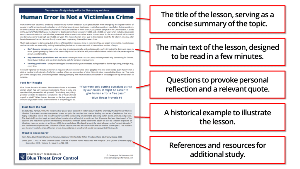 Based on the book Blue Threat: To Err is Inhuman, by human factors expert Dr. Tony Kern, the Blue Threat is defined as the internal threat that human error poses to your personal, programmatic, or organizational mission. Errors and their consequences are not predestined elements of fate. They are the product of internal and external conditions that can be seen and controlled in advance by people operating in real-time environments, if they’re armed with the right body of knowledge, tools and techniques.